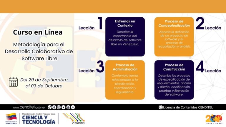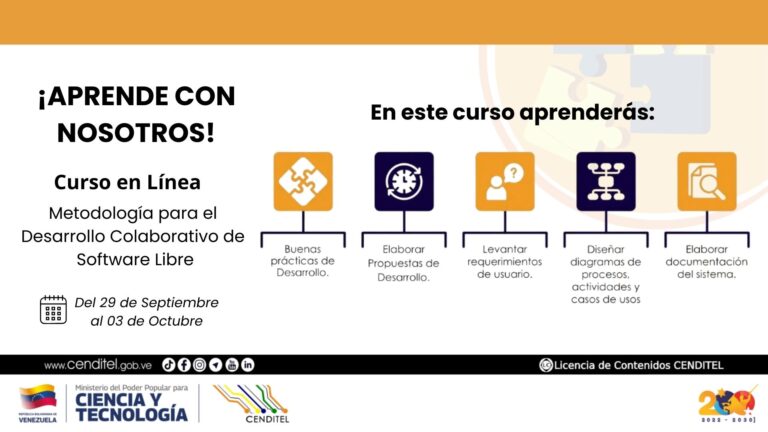 El Centro Nacional de Desarrollo e Investigación en Tecnologías Libres (Cenditel), ente adscrito al Ministerio del Poder Popular para Ciencia y Tecnología (Mincyt), comenzó las inscripciones para el curso de Metodología para el Desarrollo Colaborativo de Software Libre (MDCSL).