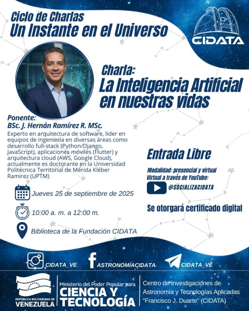 El Centro de Investigaciones de Astronomía y Tecnologías Aplicadas Francisco J. Duarte (Cidata), adscrito al Ministerio del Poder Popular para Ciencia y Tecnología (Mincyt), invita al ciclo de charlas Un Instante en el Universo.