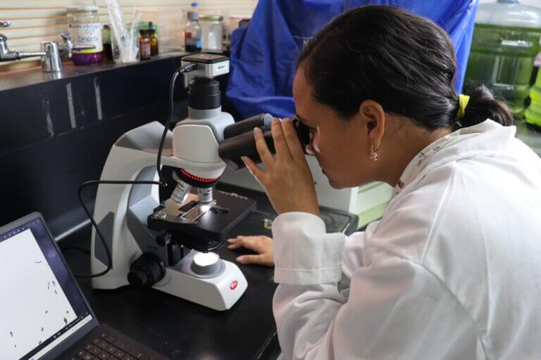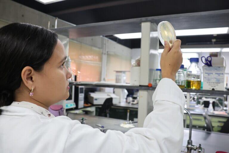 ‎La ingeniera ambiental, María Gabriela Santos, adscrita al laboratorio de Microbiología del IDEA participa en esta investigación, en la que se han realizado observaciones microscópicas y pruebas bioquímicas en bacterias.