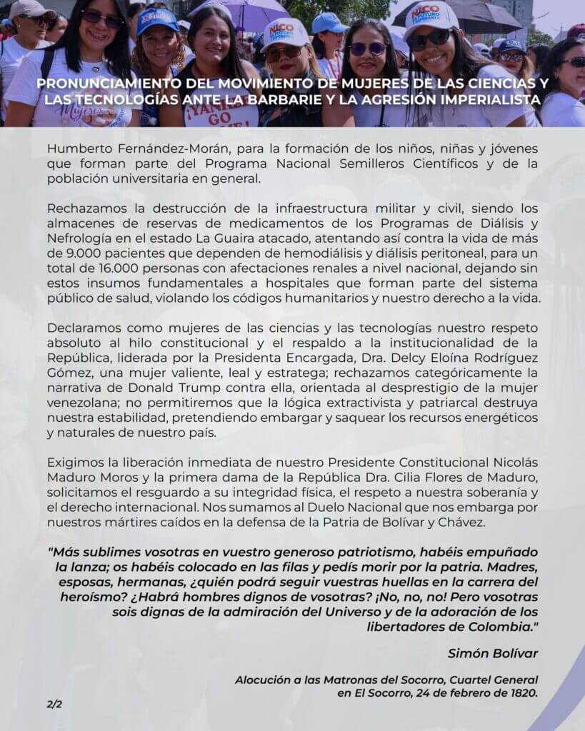 Somos científicas, tecnólogas e innovadoras que integramos y participamos del Sistema Nacional de Ciencia, Tecnología e Innovación, representamos el 53.7 % de los más de 66.838 integrantes de nuestra comunidad científica; pero ante todo somos mujeres, dadoras de vida, somos madres, abuelas, hermanas, hijas, esposas y denunciamos que el presidente de EEUU aplica una guerra no solo criminal, sino como un acto de misoginia, nosotras repudiamos contundentemente la violencia y los crímenes de lesa humanidad que se han perpetrado contra nuestra Nación.