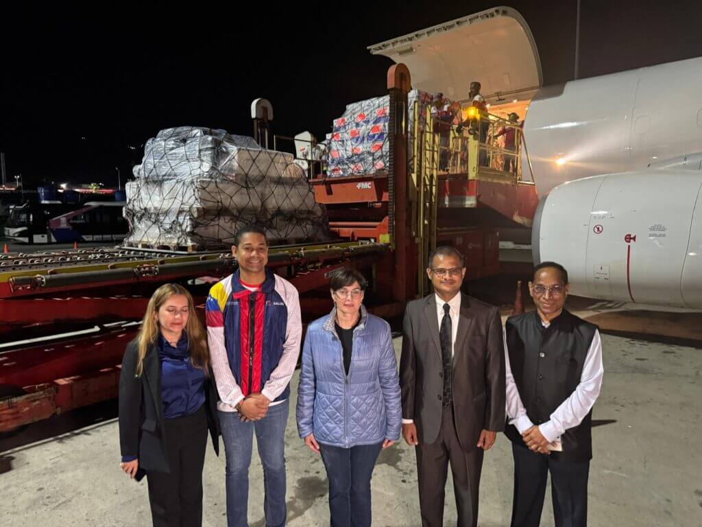 La información la dio a conocer la vicepresidenta Sectorial de Ciencia, Tecnología, Ecosocialismo y Salud, Gabriela Jiménez Ramírez, encargada de recibir el cargamento, junto al Excelentísimo Embajador de la India en Venezuela, Sr. PK Ashok Babu, y el viceministro de Hospitales del Ministerio del Poder Popular para la Salud, Jesús Osteicoechea, en el Aeropuerto Internacional de Maiquetía.